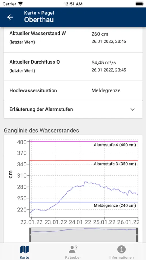 Innerhalb der Kartendarstellung können in der App mit Touch auf die Pegelsymbole aktuelle Wasserstände jeweils am Pegelstandort abgerufen werden. Weiterführende Pegelinformationen sind alternativ auf den Seiten der Hochwasservorhersagezentrale des Landes zu finden. Im Hochwasserfall erfolgt eine Einfärbung der Pegelsymbole entsprechend den aktuell erreichten Alarmstufen der Hochwassermeldepegel.