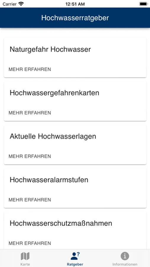 Mit der App "HochwassergefahrST" werden - im Bereich Ratgeber - wichtige Erläuterungen rund um das Thema Hochwasserrisiko und zu den Inhalten der Hochwassergefahrenkarten gegeben. Darüber hinaus finden Sie als Unterstützung für den konkreten Hochwasserfall Verweise auf weitere Informationsquellen zur aktuellen Lage sowie Erläuterungen der gebräuchlichen Alarm- bzw. Meldestufen. Ergänzend werden zahlreiche Informationen zum Thema Hochwasserschutzmaßnahmen und -vorsorge im Rahmen der Eigenvorsorge bereitgestellt. Alle relevanten Begriffe werden im Glossar erklärt. Durch einen einfachen Touch auf das entsprechende Thema werden die dazu verfügbaren Inhalte angezeigt. In den Unterbegriffen bzw. -themen befindet sich links oben ein Zurück-Button (Pfeil nach links), über den man wieder zu dem übergeordneten Begriff oder Thema zurückgeleitet wird.