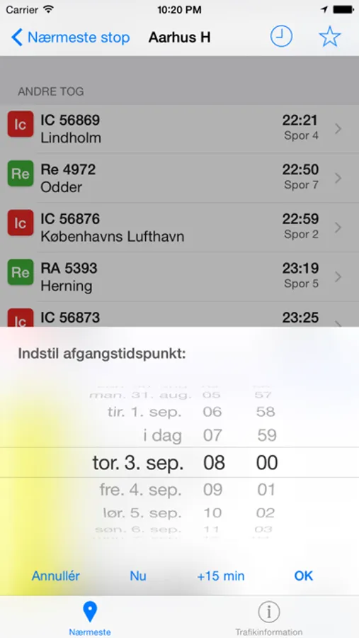 Se afgange for et andet tidspunkt ved hjælp af dato-vælgeren på afgangsskærmen. Overordentlig praktisk! Især hvis du først skal afsted imorgen tidlig.