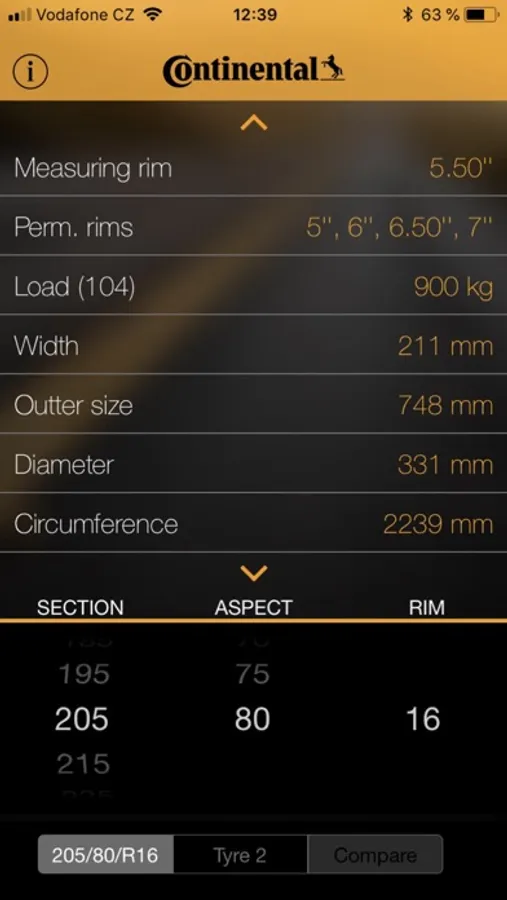 Pomocí číselníku zadejte šířku, profil a ráfek pneumatiky a aplikace vám ihned zobrazí všechna relevantní data jako např. údaje o nominální šířce, profilovém čísle, nosnosti apod.