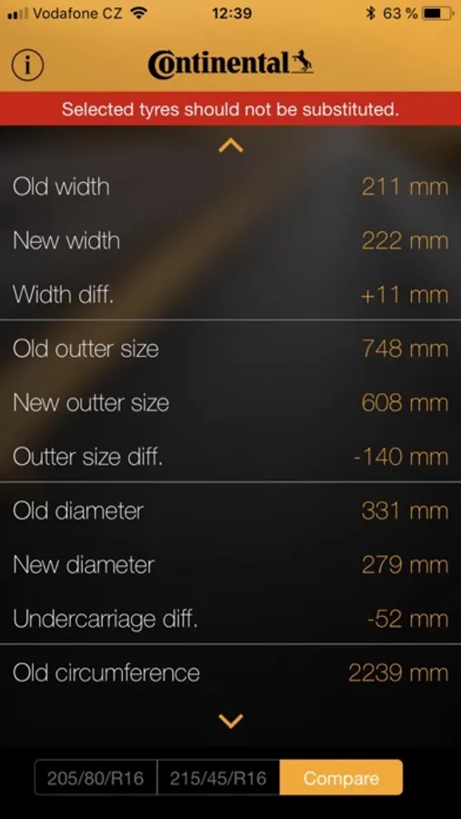 Pro porovnání zadejte údaje pro obě pneumatiky a stiskněte tlačítko Porovnat. Zobrazí se informace, zda je možné pneumatiky zaměnit či nikoli.