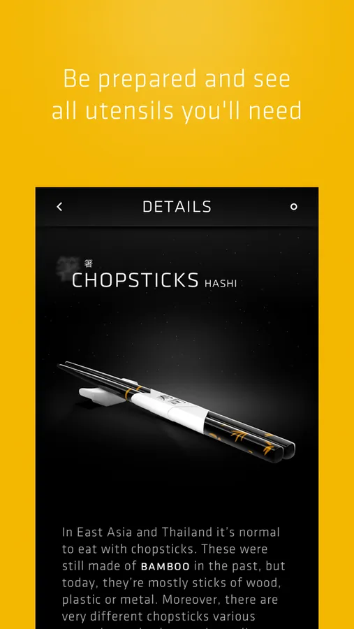 Five different categories are offering you a wide variety of information and many topics to discover. Everything was designed and painted from scratch, to achieve highly aesthetic images and views to make the preparation of sushi the biggest possible pleasure for you!