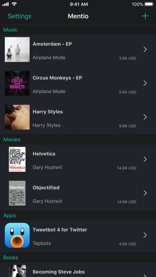Mentio is your personal media wish list, so you never forget a recommendation or a wish. Mentio supports Music, Movies, iOS Apps, Books and TV-Shows using the iTunes Store.