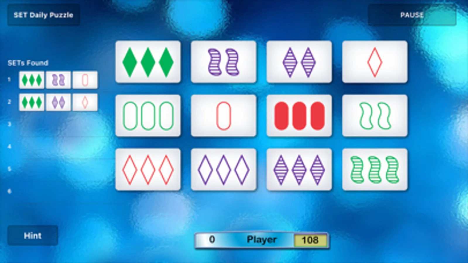 The goal is to find all six SETs as quickly as possible. A SET is 3 cards in which each individual feature (color, shape, number and shading) is either all the SAME…or all DIFFERENT on each card.