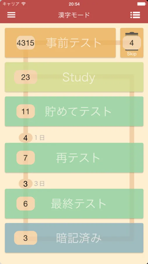 →覚えていない単語は数回のテストの中で勉強に戻ってくるからとりあえず今覚えたら次の単語の勉強へ