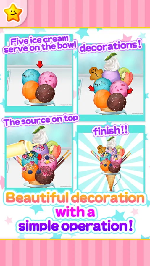 Role-play as an ice-cream shop server and take the customer's order! There's a lot of ice cream flavors and varioustoppings, from whip cream to fruits, from candiesto sauces! Make your own original ice-cream as many times as you want!