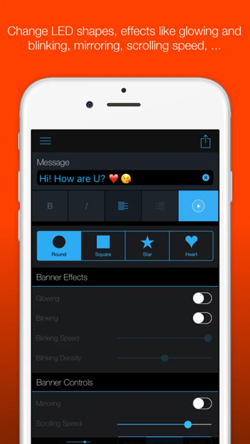 LED Banner Pro is the only banner app that can e-mail and save created LED banner animations as templates, MP4s or animated GIFs.