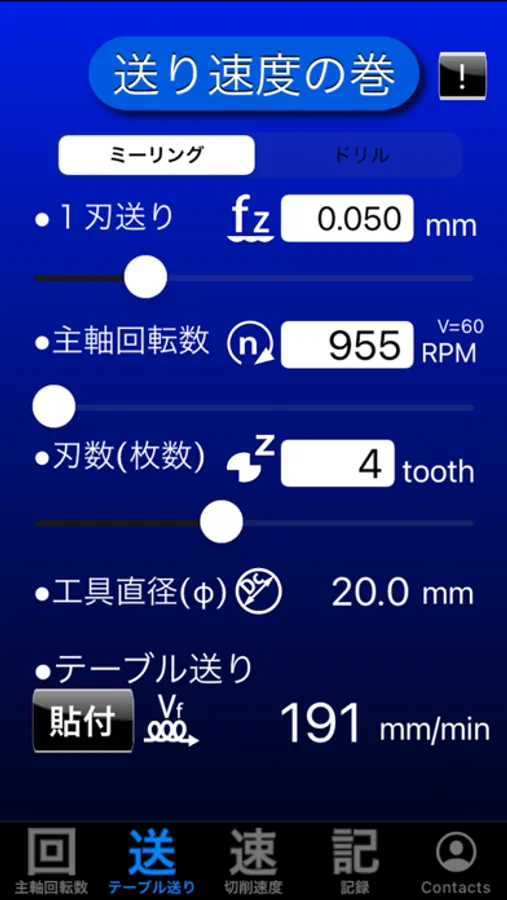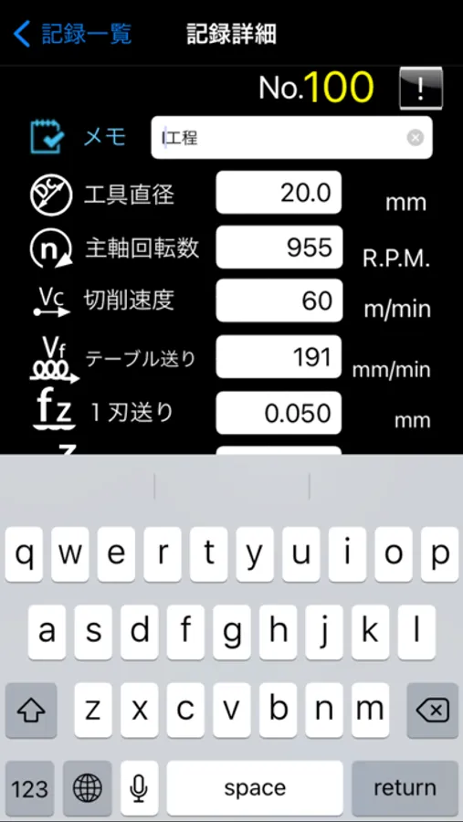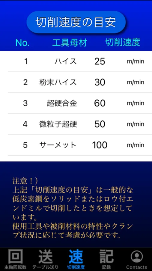 本アプリはフライス盤・マシニングセンタ向け機械加工の切削条件の計算機(プログラム)です。前作「切削回転送り」の改良版になります。機能アップした箇所はインターフェイス周りの改良、計算結果が100件まで保存可能になった(フリー版では5件まで)こと、記録詳細データの編集機能の追加。切削速度の目安表を搭載しました。ドリル加工にも対応しました。ほとんどの場合マシニングセンタ1台分のツールマガジン分をカバーできます。