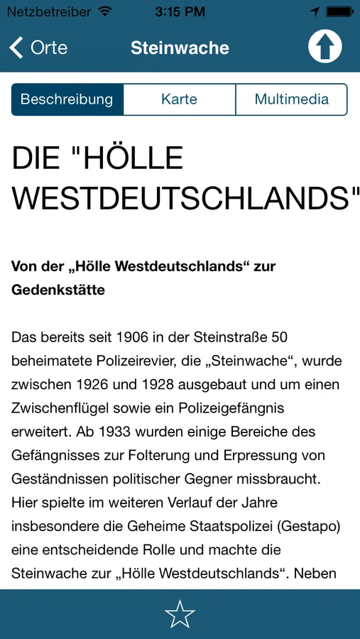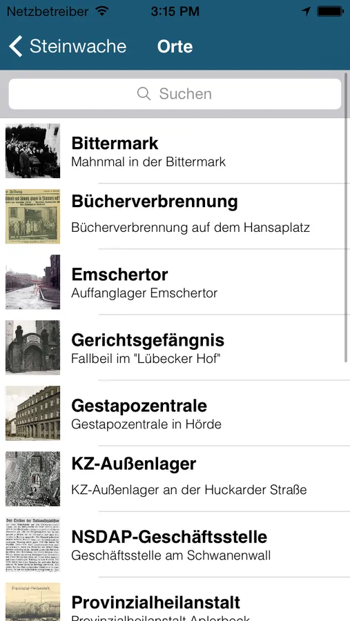 Die App führt durch die Dortmunder Innenstadt und die anliegenden Vororte. Sie informiert über Stolpersteine und Orte, die für Dortmund im Nationalsozialismus von Bedeutung waren, z.B. über den Standort der alten Synagoge oder das Außenlager des KZ Buchenwald. Mit Hilfe der Kartennavigation und einer Anpeilhilfe wird man zum gewünschten Ort gleitet.