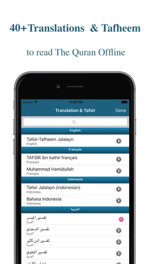 - 8 Tafsir Arabic ( Muyasser, Saadi, Ibn Kathir, Kortobi, Tabari , Baghawi , Jalalayn and Tahrir w Tanwir Taher Ben Achour)