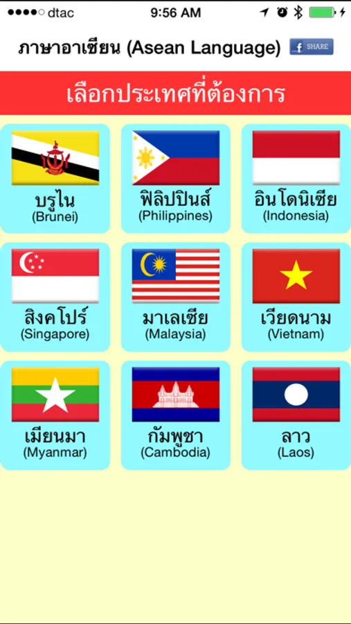 แอพพลิเคชันภาษาอาเซียน asean language aec ประชาคมอาเซียน เอเชีย ประเทศอาเซียน จัดทำขึ้นเพื่อเผยแพร่และให้ความรู้สำหรับคนที่อยากเรียนรู้ภาษาอาเซียน หรือหัดพูดภาษาอาเซียน 9 ภาษา คือ ภาษาบรูไน ภาษาฟิลิปปินส์ ภาษาอินโดนิเซีย ภาษาสิงคโปร์ ภาษามาเลเซีย ภาษาเวียดนาม ภาษาพม่า ภาษาเมียนมาร์ ภาษากัมพูชา ภาษาลาว แยกออกเป็นหมวดหมู่ให้เลือกหัดพูด ได้แก่