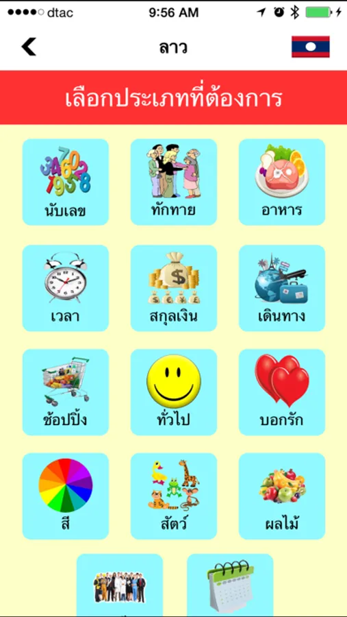 1.การทักทาย 2.อาหาร 3.นับเลข 4.เวลา 5.สกุลเงิน 6.ช๊อปปิ้ง 7.เดินทาง 8.ทั่วไป 9.บอกรัก 10.สี 11.สัตว์ 12.ผลไม้ 13.อาชีพ 14.วัน เดือน