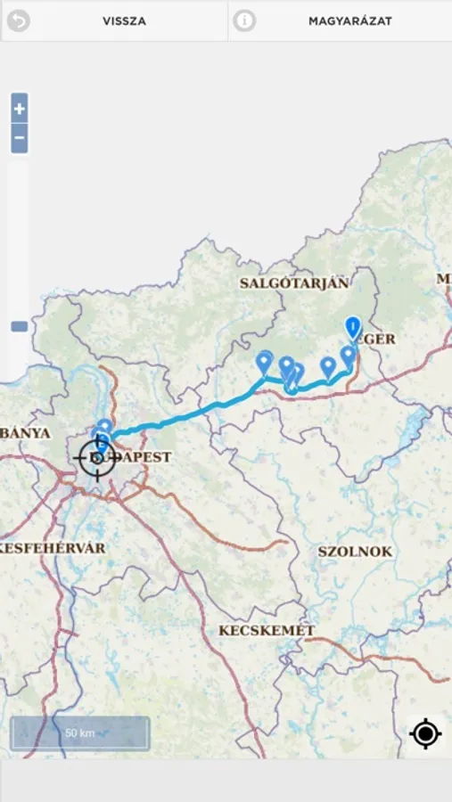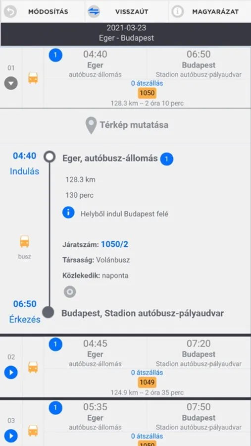 A térkép a találati listából, és az indulási jegyzékből egy járat kiválasztása után, a részletes információkban a térkép ikon megérintésével előhívható. A térkép előhívásakor a kiválasztott járat induló, és érkező megállóhelye, valamint útvonala is látszik. A megállóhelynevet a jelölő pontot megérintve hívhatjuk elő. Amennyiben be van kapcsolva a tartózkodási hely, megjelenik a térképen a telefon GPS pozíciója is.