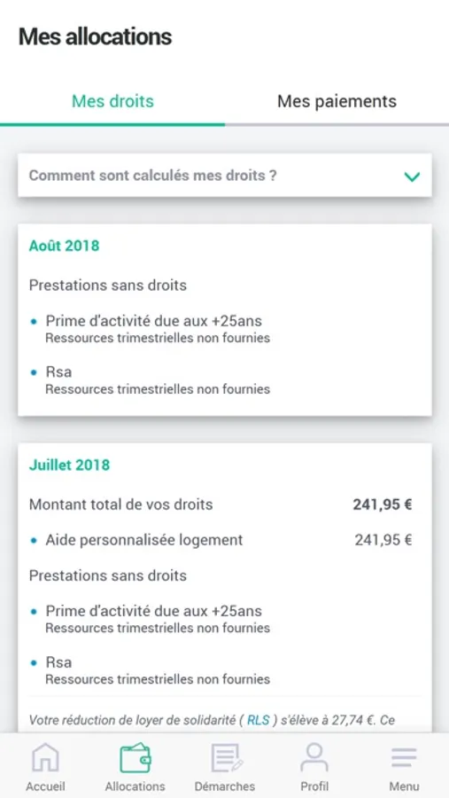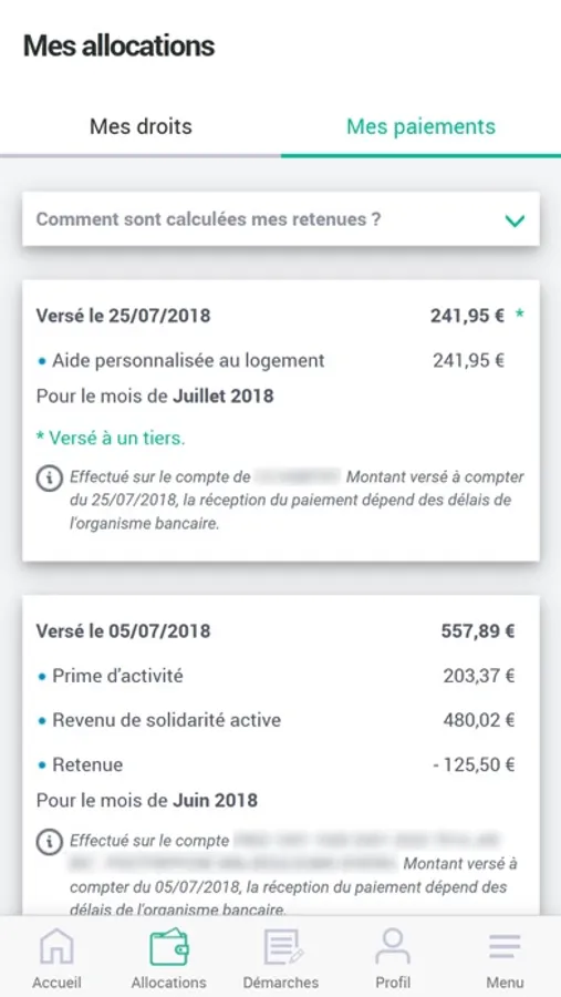 Accédez rapidement à vos 10 derniers paiements (dates et montants) en parcourant votre historique jusqu'aux 24 derniers mois. Vous pouvez également télécharger sur votre mobile vos relevés ou attestations au format PDF.