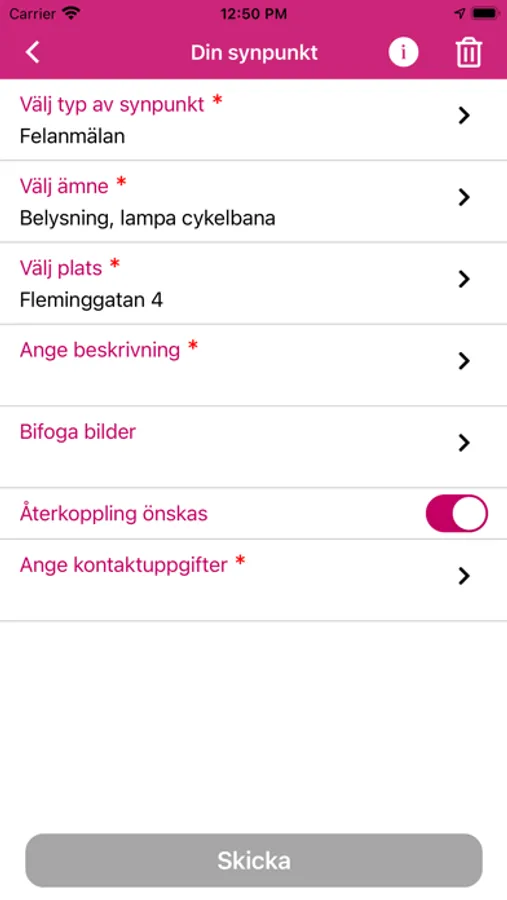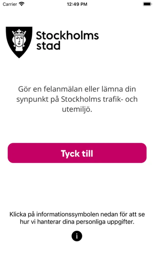 Med den här appen kan du tycka till om Stockholms stads trafik- och utemiljö direkt i mobilen. Skicka in en fråga, en idé, ett beröm, ett klagomål, en felanmälan eller en ordningsstörning när du vill, var du vill. Genom att använda telefonens gps-funktion är det lätt att ange en plats för din synpunkt. Du kan även bifoga bilder för att ytterligare beskriva ditt ärende. Välj om du vill få återkoppling via e-post eller om du vill vara anonym när du tycker till.