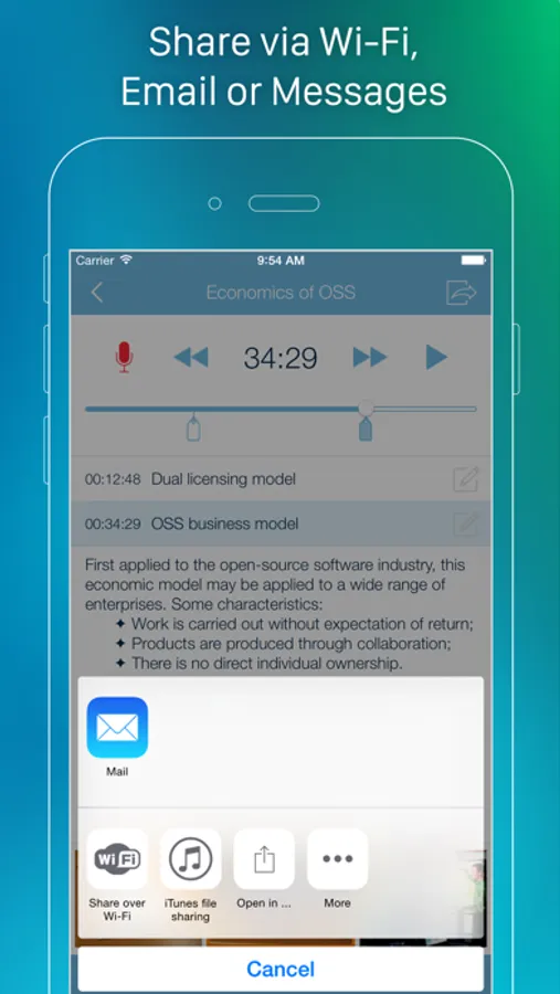 • Share recordings via Wi-Fi, AirDrop, Messages, Email or iTunes File Sharing