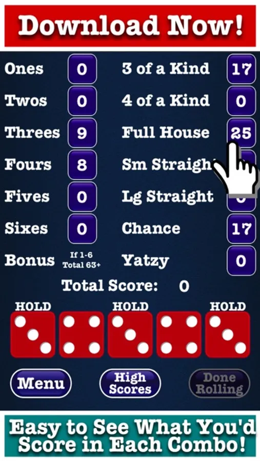 • Easy to see how many points you would score for your current dice in each combo, so you can concentrate on your strategy!
