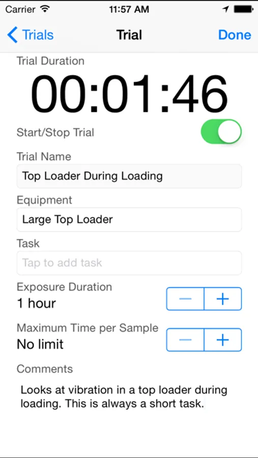The application is intended for use within occupational contexts to provide a simple screening or monitoring tool for use by workplace safety and health staff. It is suitable for use to estimate whole-body vibration amplitude of seated operators of all vehicles, plant or equipment. Use is straight forward. After entering trial information, sampling is commenced with a tap and the device placed on the operator’s seat during a period of normal operation. At the completion of the period, sampling is ended with a tap and the results calculated and made available for viewing and emailing.