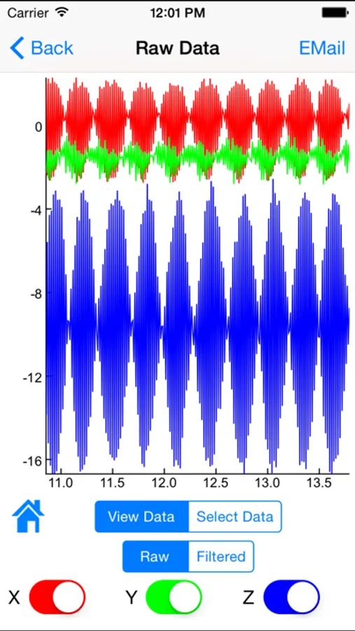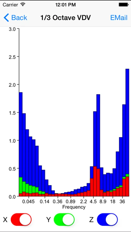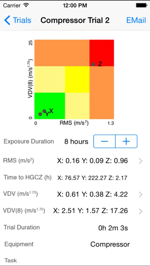 The Whole Body Vibration application (WBV) utilizes the accelerometer within an iPod or iPhone to provide an estimate of vibration amplitude consistent with the methods described in ISO2631.1. Frequency weighted r.m.s and VDV values are presented graphically with reference to the health guidance caution zone for exposures of varying durations. Summary data and acceleration time series are available to be emailed or downloaded.