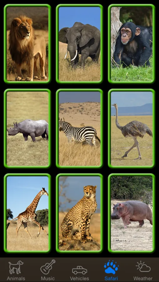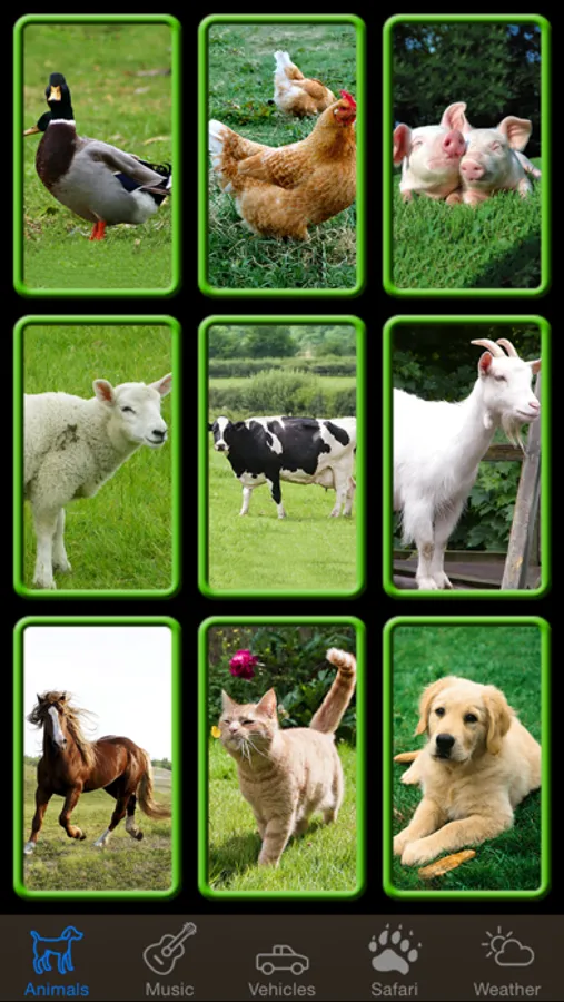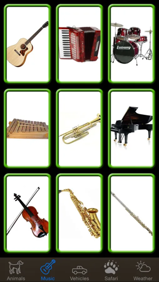 Your child simply tap on one of the images and it will be shown in full screen quality and a sound related to the image will be played. For example: a happy dog barking, the mighty roar of the lion, or the rhythms of the guitar or the saxophone.