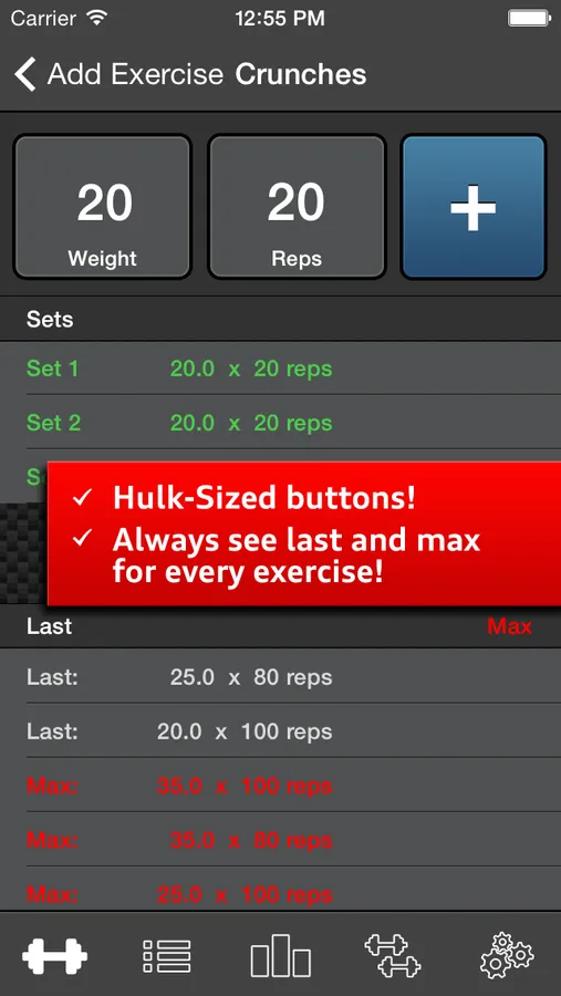 - Shows your previous workout results right on the input screen of every exercise (weight and reps from last exercises and the all time maximums)