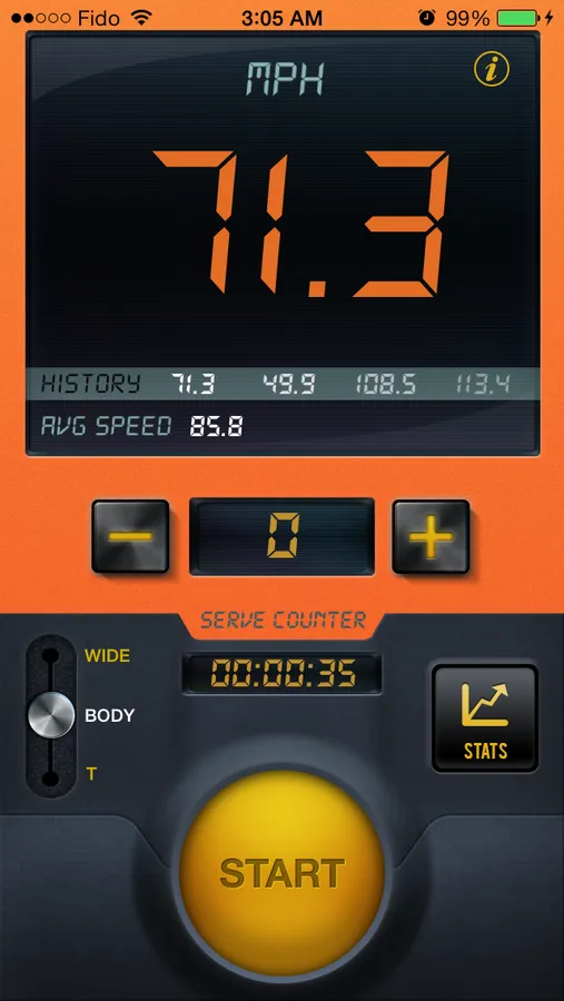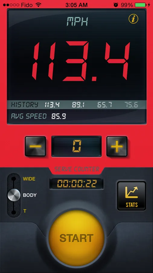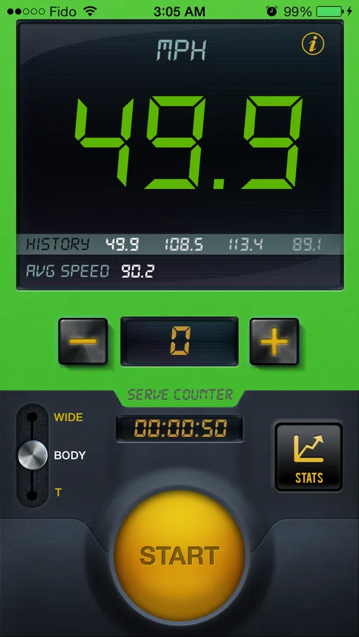 Tennis Serve Speed Radar Gun uses color coding for easy identification of your speed. The entire user interface will change in color according to the speed of your throw.