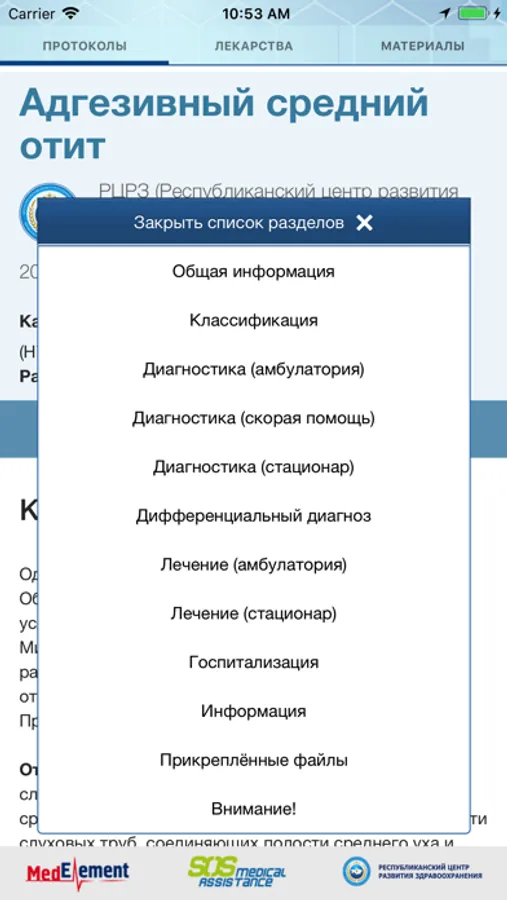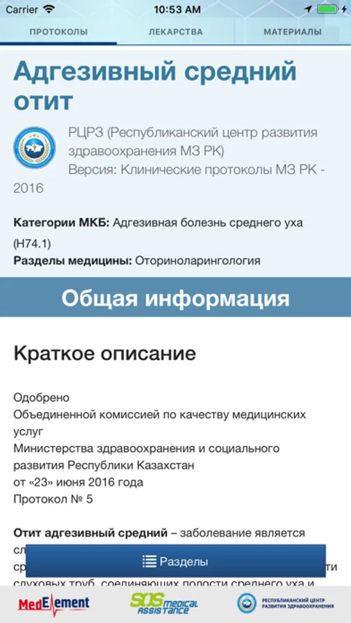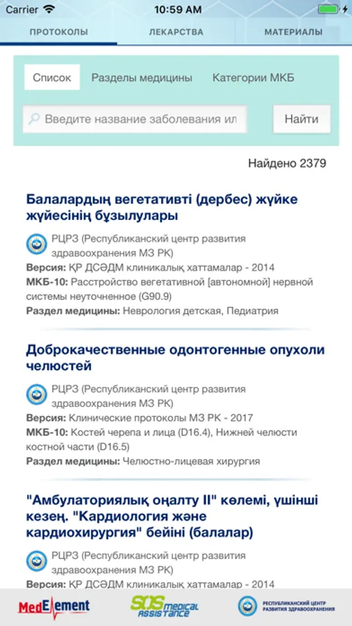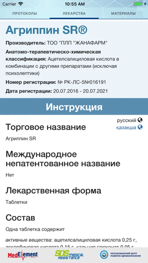 Приложение дополнительно включает раздел "Лекарственные средства". В нем представлены инструкции к препаратам, зарегистрированным в Государственном реестре ЛС РК, на казахском и русском языках (раздел в процессе наполнения).