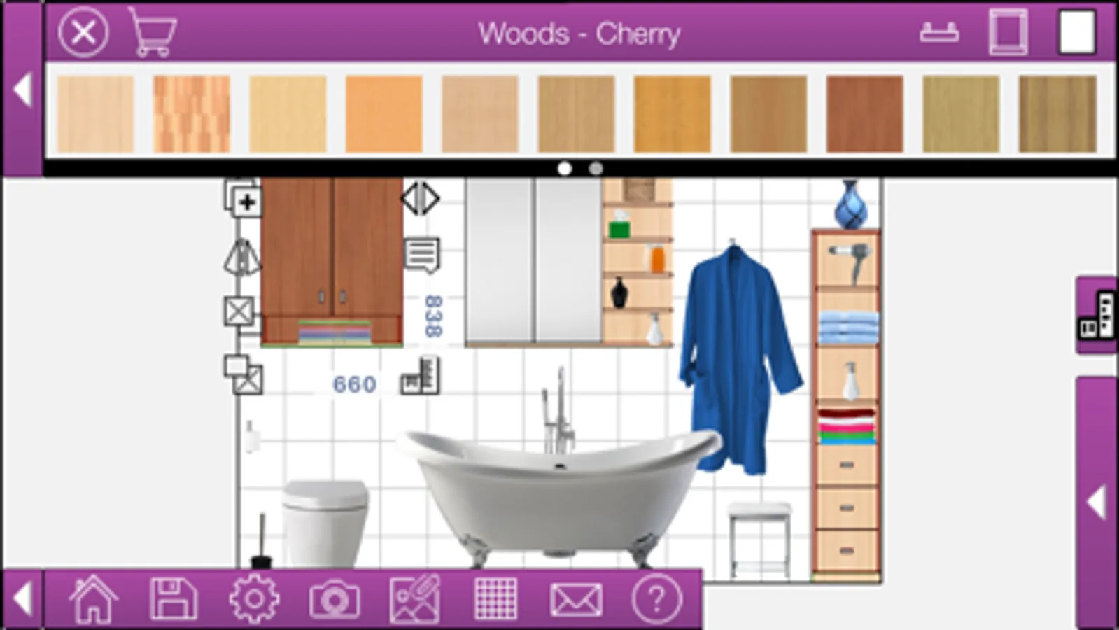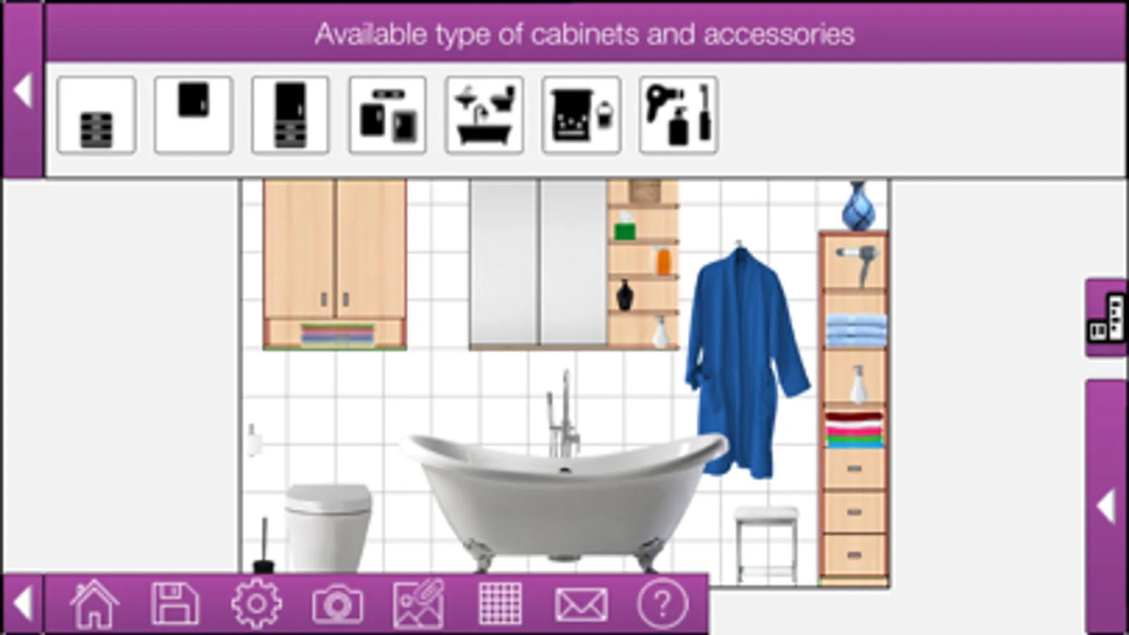 Design a bathroom with your iPad, iPhone or iPod, inserting items in the front view of each one of the room walls. Insert cabinets, furniture and accessories. Select materials and finishes among woods, colors and accessories. Save your designs in your device or email them in ".pdf", ".png", ".jpg" or ".dxf" format.
