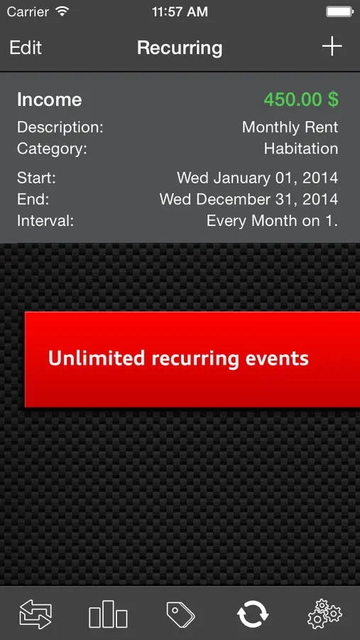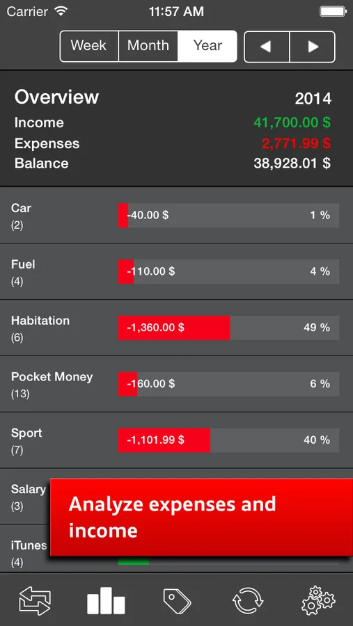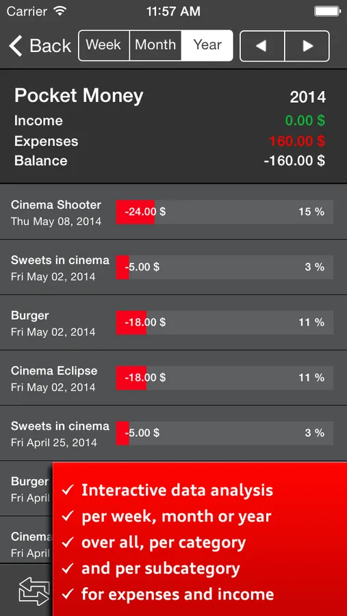 View your expenses and incomes by calendar week, by month or by year. Or just scroll through the last couple of weeks with a single swipe of your finger. Altogether there are 11 different graphs for different views on your data.