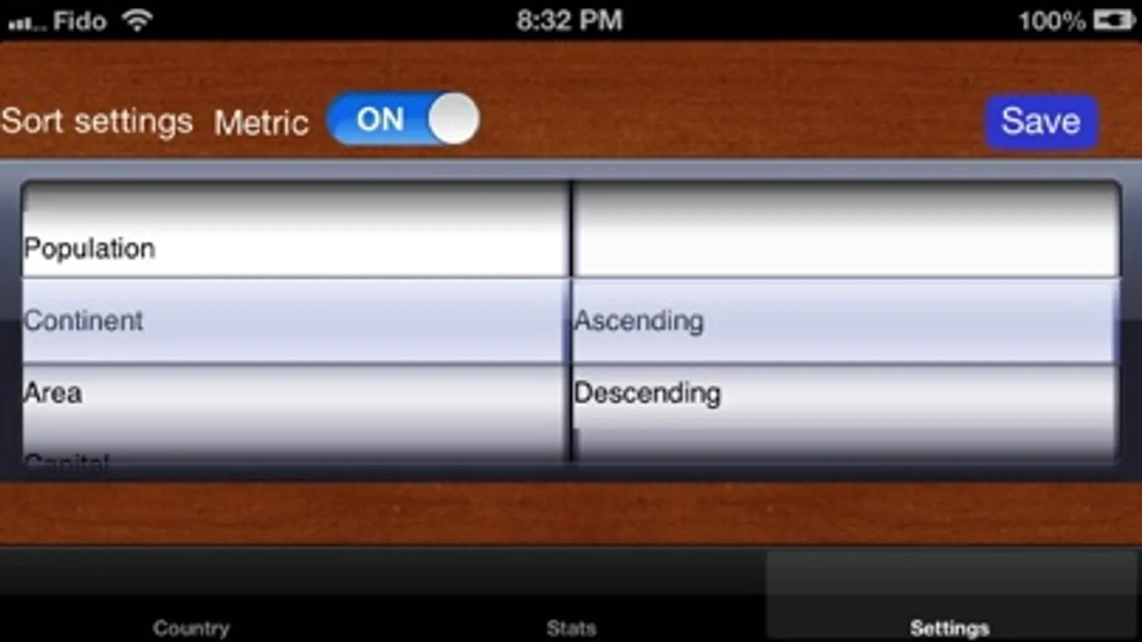 Stats for total number of countries, total area, total population for every search result as well as webviews for all countries and search categories. Background music with Blue Danube by Strauss with sound-off option.