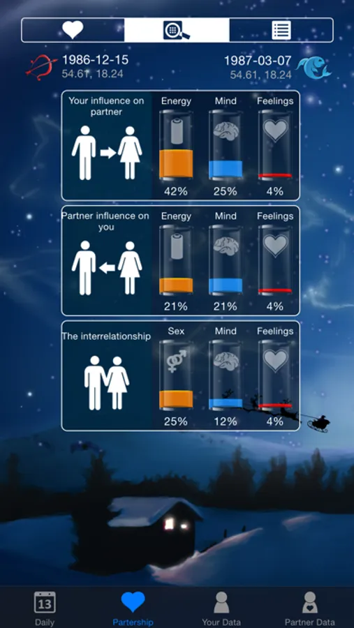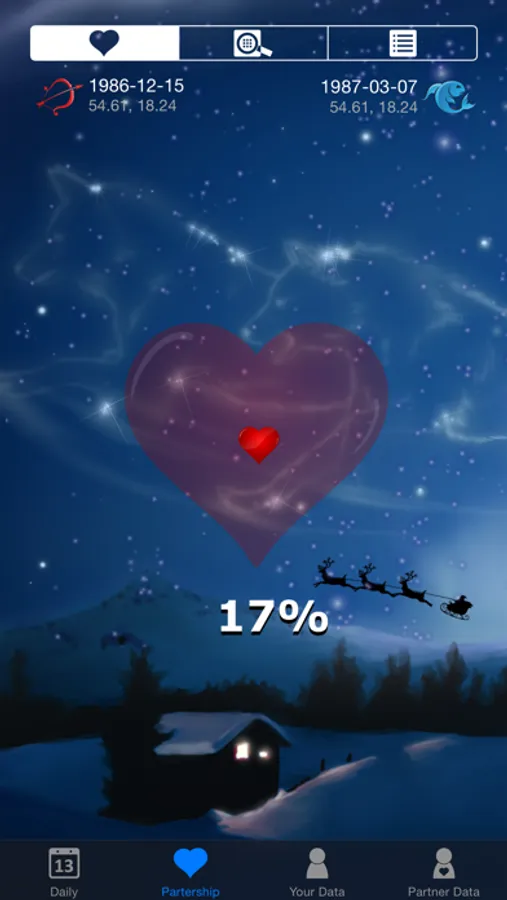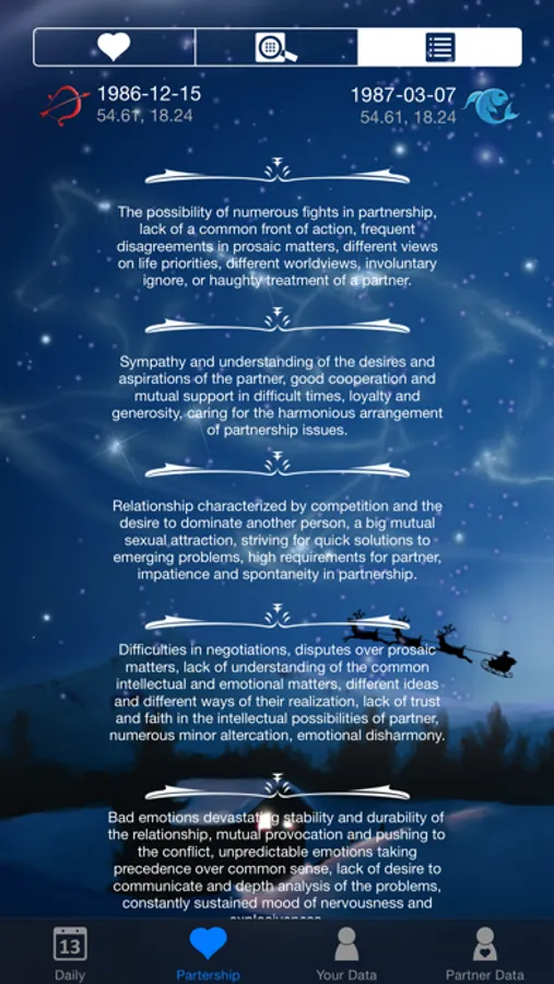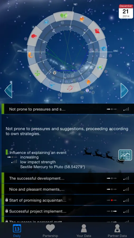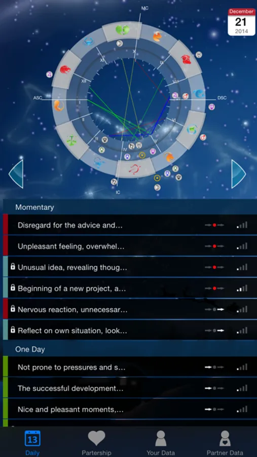 Our horoscope analyzes the map of the sky when You were born, and compares it with the current positions of the planets. We obtain interpretations from professional astrologists on how every transit impacts on Your every day life. Moreover You can check where the description came from. We show professional charts with transits in pair with every interpretation. This way You can be sure You don't read a fake horoscope. Additionally You can check relationship with your partner or friends on percentage graphs and with wide descriptions.
