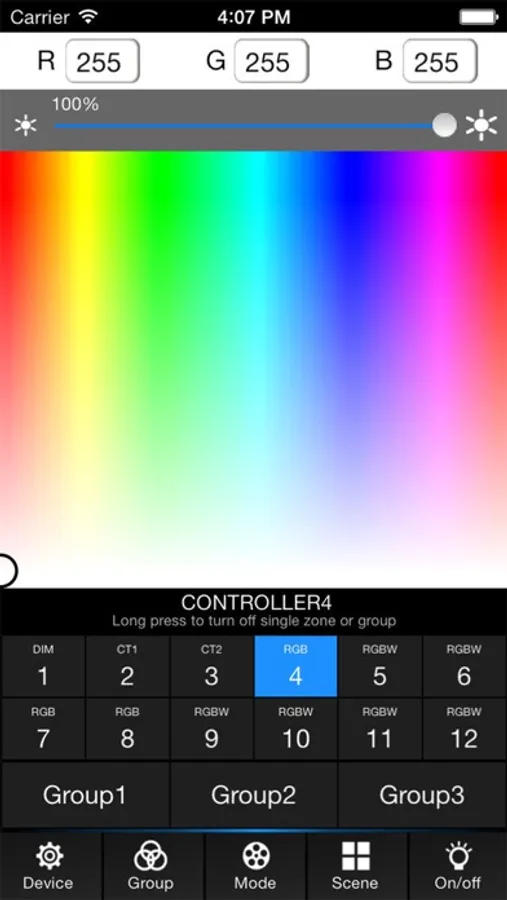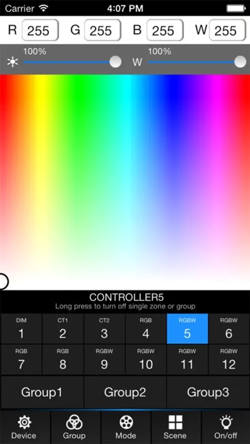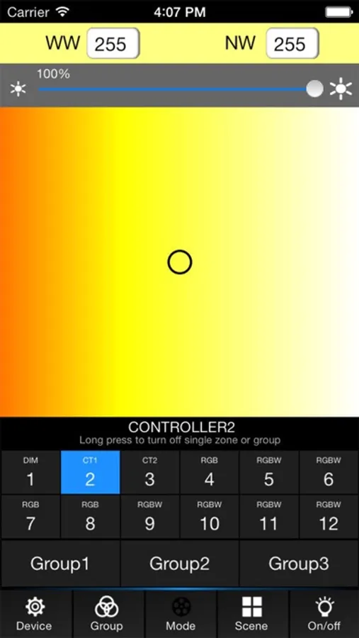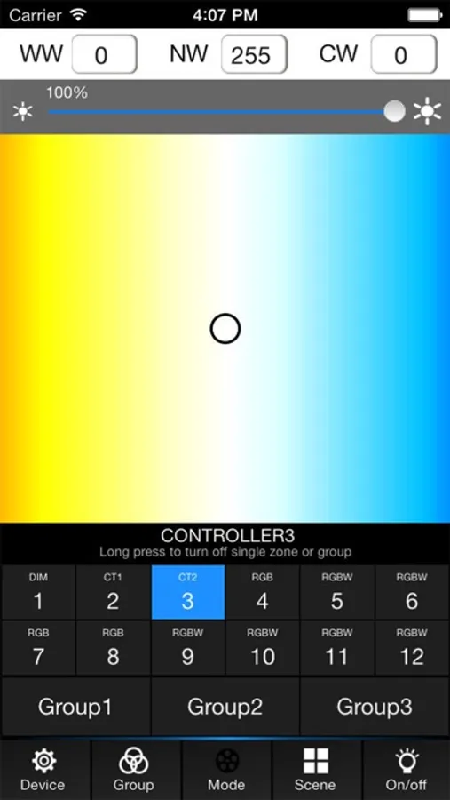 The software support 12 zone control,Each zone can set to one of five kinds lamp: DIM(W),CT1(NW+WW), CT2(NW+WW+CW),RGB and RGBW. Each zone have four scenes to save or load.
