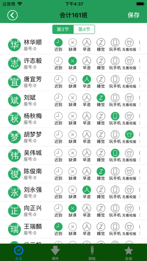 3 【点名】可以记录学生的考勤信息,如迟到、旷课、请假、出勤等都可以实时记录,学生和家长都可以查阅到。