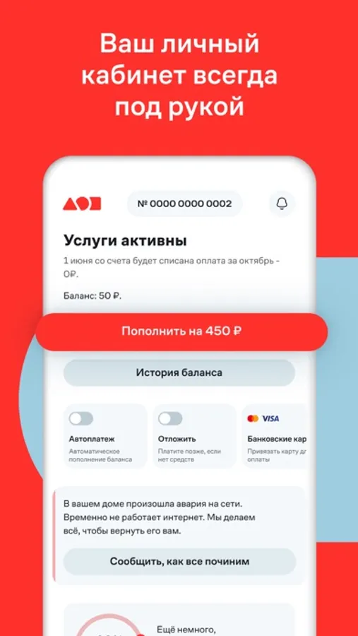 • Оплачивайте свои услуги без комиссии удобным способом в приложении. Не хотите каждый раз вводить данные своей карты? Тогда оплачивайте через Систему быстрых платежей. Либо привяжите карту к договору и оплачивайте услуги по ней – это удобно и безопасно.