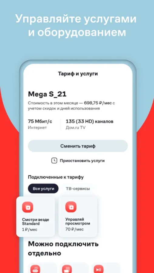 • Забыли, что входит в ваш тариф? Вы всегда можете посмотреть это приложении – какая у вас скорость интернета, сколько подключено ТВ-каналов, а также какие услуги уже есть тарифе, а какие подключены за дополнительную плату.