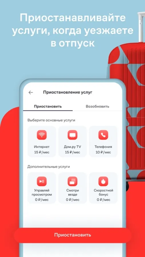 • Уезжаете в отпуск или на дачу? Вы можете приостановить услуги на определенный период времени и платить за услуги меньше. Просто выберите услуги, которые хотите приостановить и даты, в которые вы не планируете ими пользоваться. А если ваши планы изменились, возобновить услуги можно прямо в приложении.