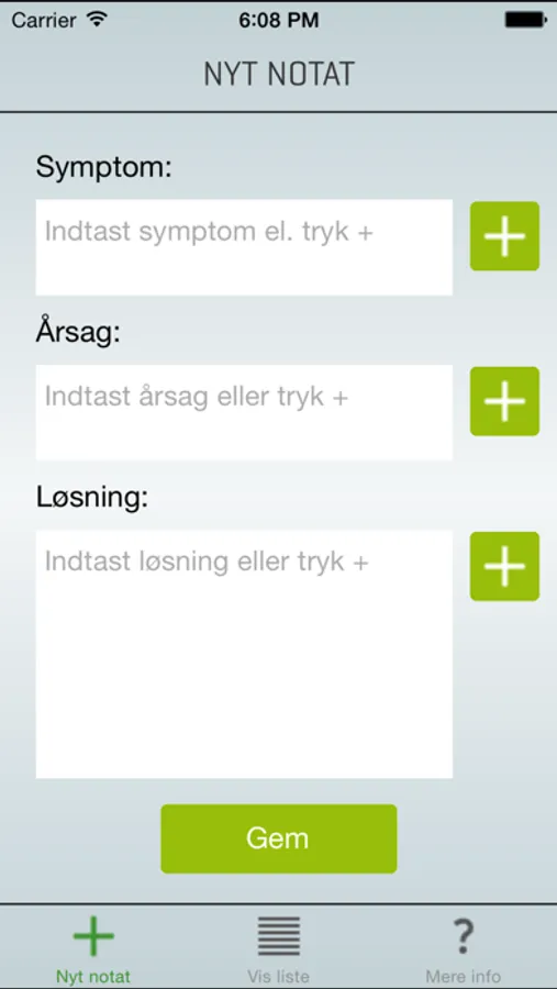 For hvert felt kan du enten indtaste en ny ting eller også vælge tidligere indtastede ting eller standardforslag fra en list ved at trykke på tilføj (+) knappen til højre for feltet. Når du har specificeret symptom, årsag og læring skal du trykke på knappen ”Gem” nederst på siden (evt. skal du rulle ned først). Du kan senere rette i notatet, hvis du ønsker.