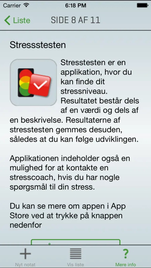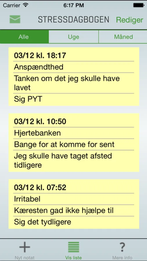 Du kan sende stressdagbogen (notaterne) som e-mail, f.eks. til din stresscoach. Dette kan du gøre med knappen med et billede af et brev øverst til venstre på stressdagbogskærmen.
