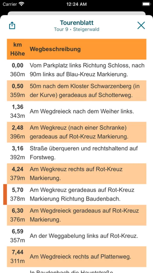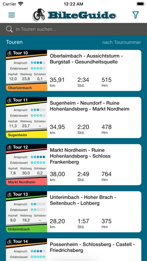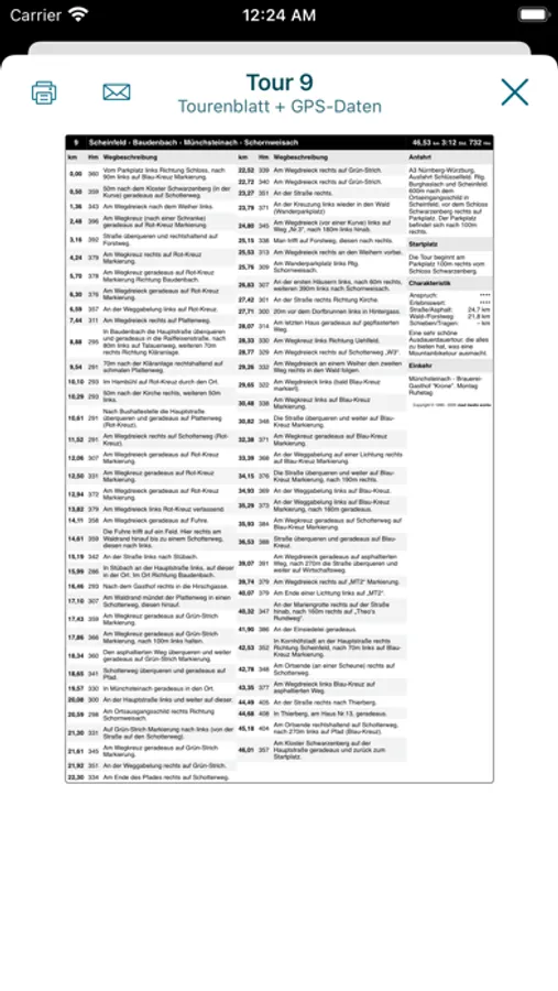 Die App bietet 15 Touren mit Wegbeschreibungen, Höhenprofilen, Kartendaten und aktuellen Wetterinformationen. Die Touren lassen sich nach Startplatz, Anspruch oder Erlebniswert sortieren und filtern. Nicht zuletzt kann man sich einfach zum Startplatz oder einer Einkehrmöglichkeit navigieren lassen. Die Touren sind übersichtlich dargestellt, anhand der Farbe ist deren Schwierigkeit leicht zu erkennen. Die neuesten Features sind das Ausdrucken des Tourenblattes via AirPrint und das Senden der GPS Daten zu einer Tour via E-Mail. Und: wer keinen AirPrint Drucker hat kann sich das Tourenblatt einfach selbst per E-Mail senden.