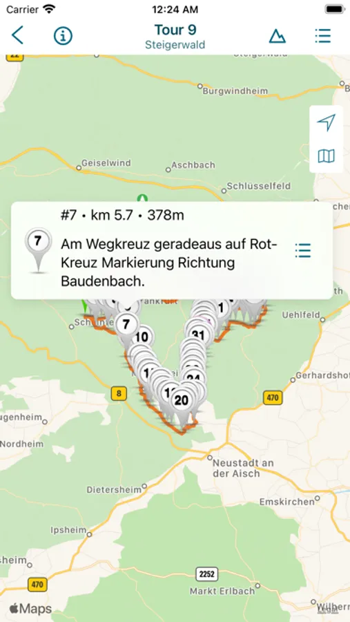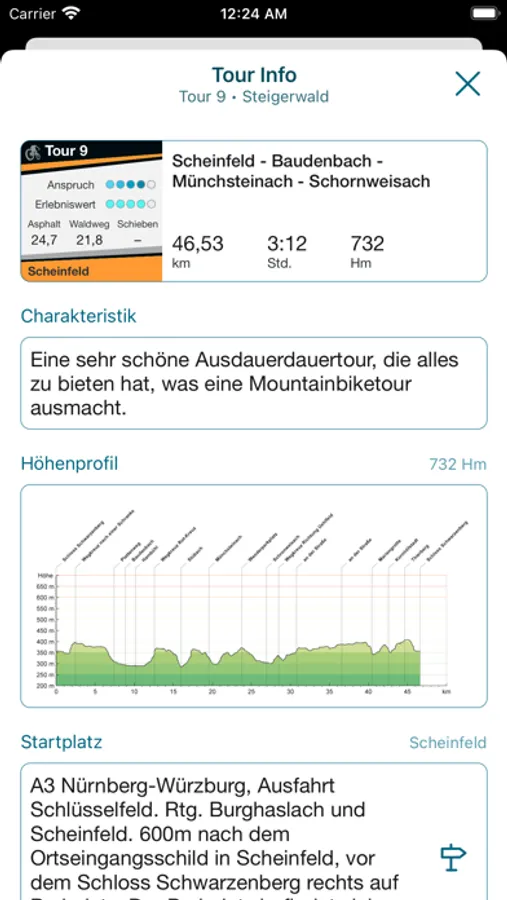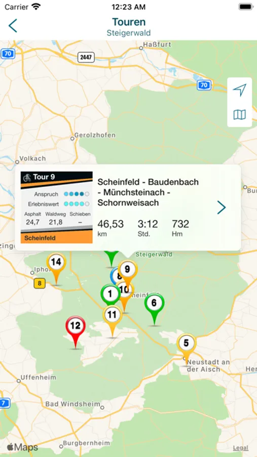 Der Mountainbikeführer für den Steigerwald als App für iPhone und iPad. Den Biker erwarten einsame Touren, fantastische Trails und viel Sehenswertes. Es gibt leichte Touren für den Einstieg, lupenreine Mountainbiketrails und anspruchsvolle Ausdauerrouten. Weite Wälder des Naturparks Steigerwald, Buchen und Birken sorgen für ein abwechslungsreiches Bild. Die überaus dünne Besiedelung der Gegend verspricht Natur, Idylle und Ruhe in einer herrlichen Landschaft. Wichtigste Sehenswürdigkeiten sind Ruine Scharfeneck und Überbleibsel von im 30-jährigen Krieg zerstörten Burganlagen. Das über 1200 Jahre alte Scheinfeld, mit seiner von Fachwerkhäusern geprägten Altstadt, dem Kloster und Schloss Schwarzenberg, sind Zentrum des Naturparks.