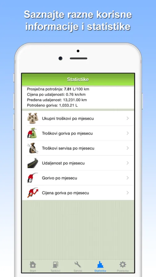Evidencijom tankova goriva prilikom svakog posjeta benzinskoj postaji možete dobiti puno informacija o troškovima svog vozila i statistikama njegovog korištenja. Znat ćete točno koliko novaca trošite na gorivo svog vozila, koliko goriva Vaše vozilo troši za prelazak udaljenosti od 100 km ili 100 milja, koju ste udaljenost dosad prešli.