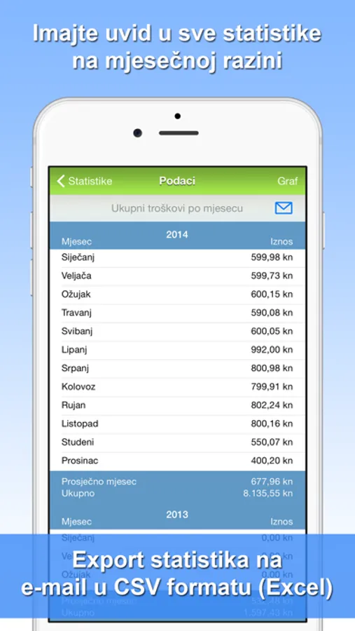 Aplikacija će Vam prikazati pregledne statistike za svaki mjesec (podatke i dijagrame).
