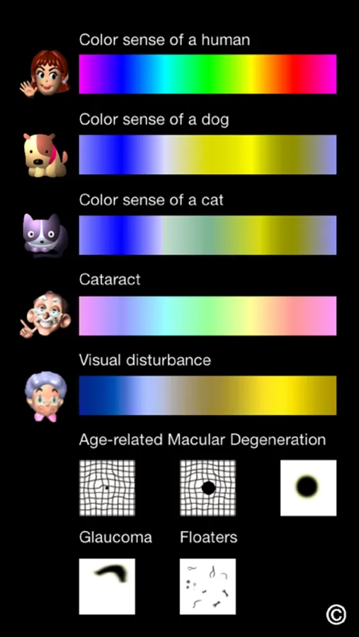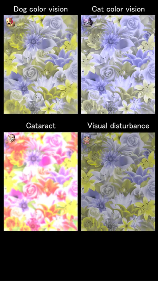 This app is to simulate sight of dog and cat, sight of human who has disease of eyes, by filtering camera image. The filtered camera image can be saved to photo library as a still image.