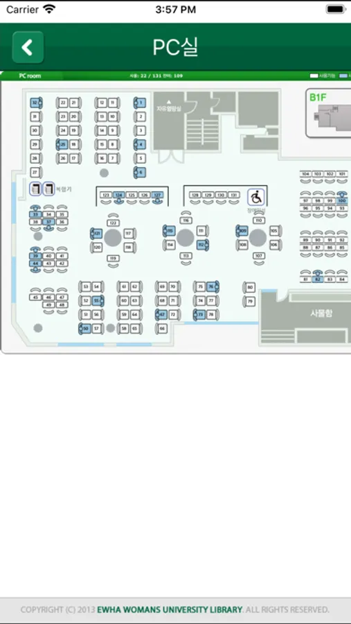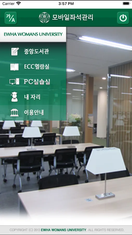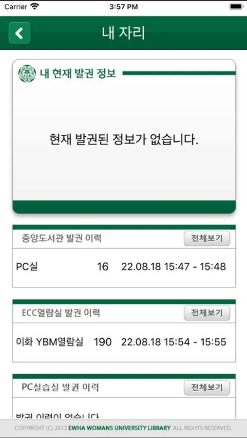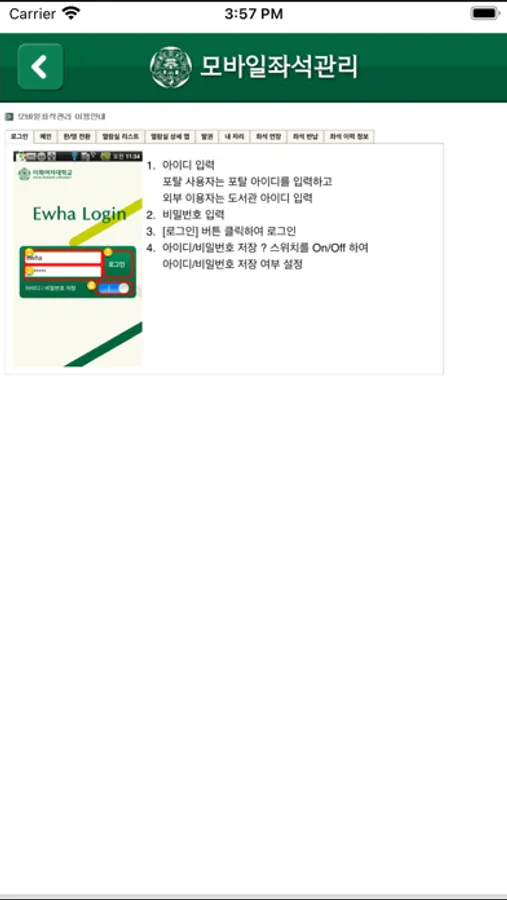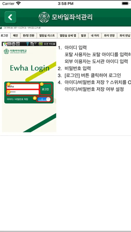 이화여자대학교 모바일 좌석관리 서비스 입니다. 교내 도서관, PC실습실의 좌석을 발급 받고 연장, 반납 시 사용하실 수 있습니다.