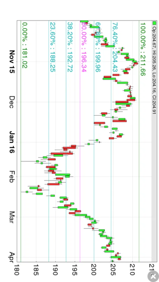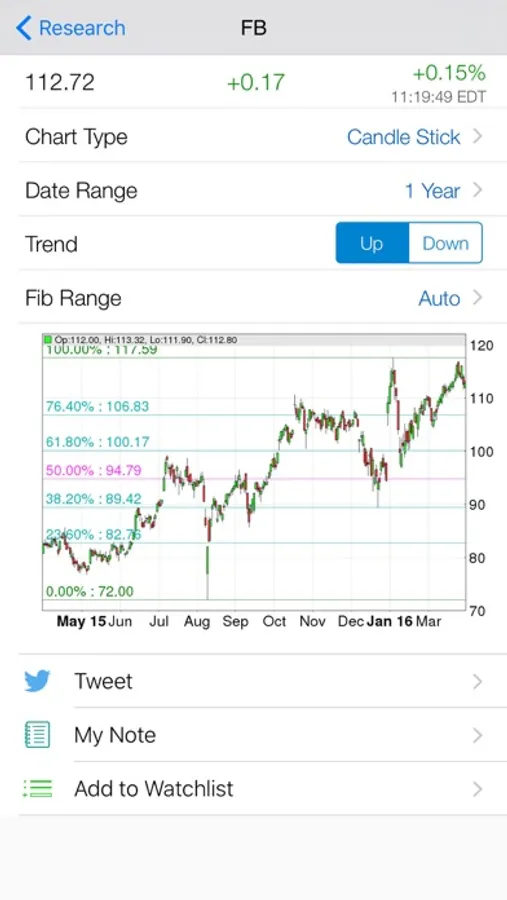 Fibonacci retracement on Stock Chart has never become this easy! Just enter the ticker symbol (or a partial symbol) you desire and bingo! you are there! A neat stock chart with Fibonacci lines and various Chart Types and Date Ranges is specially presented. Choose different type, date range, Fibonacci trend & range, you will have a better read / analysis on your stock. Tap the chart to view an enlarged full screen chart.