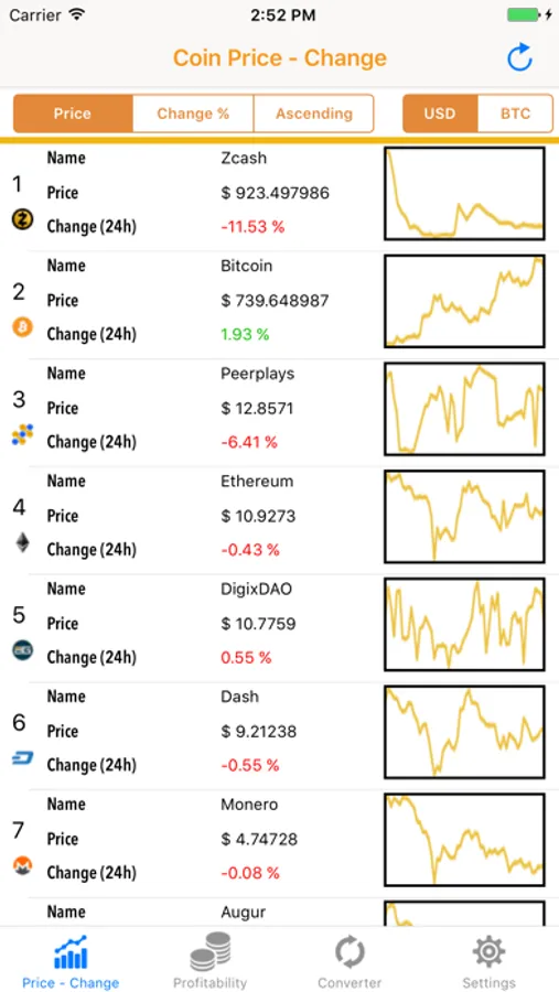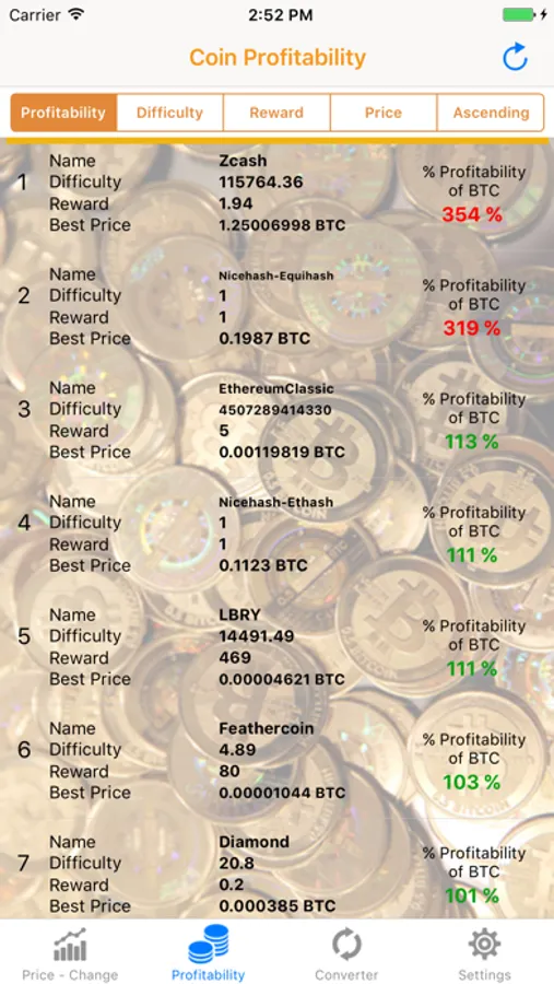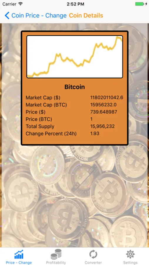 Currently the app includes more than 80 different crypto-currency data and graphics. You can filter or order crypto-currencies with price order,price increase percentage,profitability or btc price of the currency.