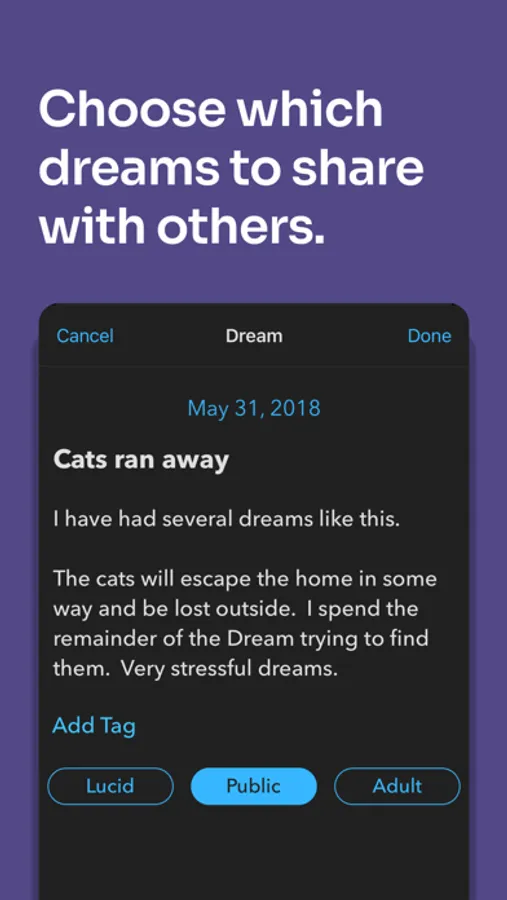 For any dream you enter, you can keep it private or share it to the Dream Wall, a dream based social network where you can share your dreams with other users to get feedback. Share as many or as little as you want.