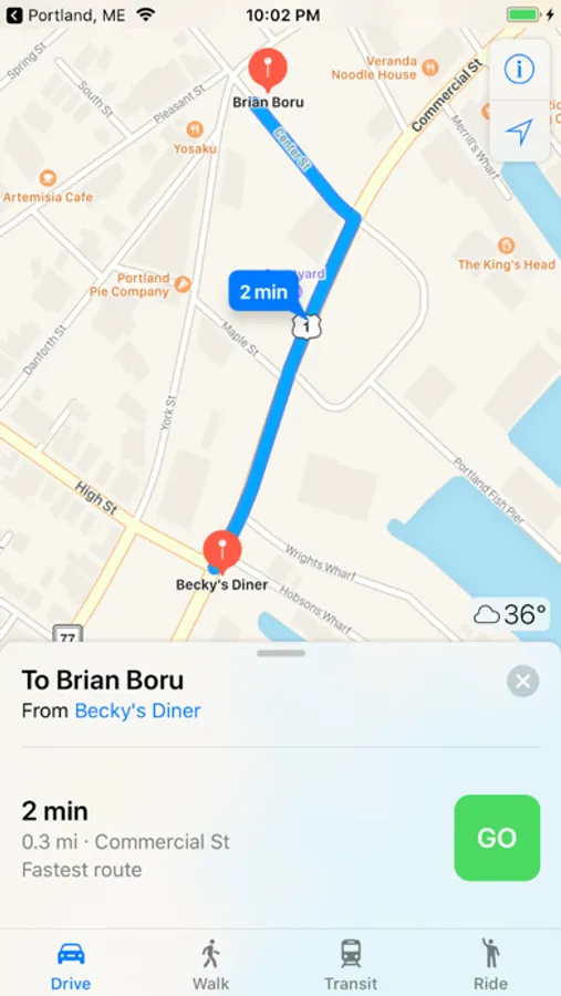 Would you like to know how to get from The Portland Museum of Art to Fore Street Restaurant? Simply set the spinners and the app will display the route, complete with turn-by-turn directions and driving and walking times.
