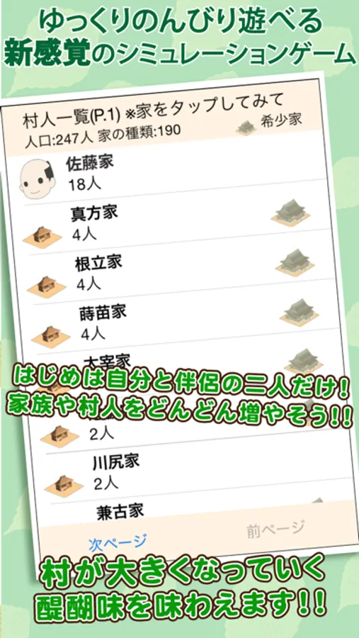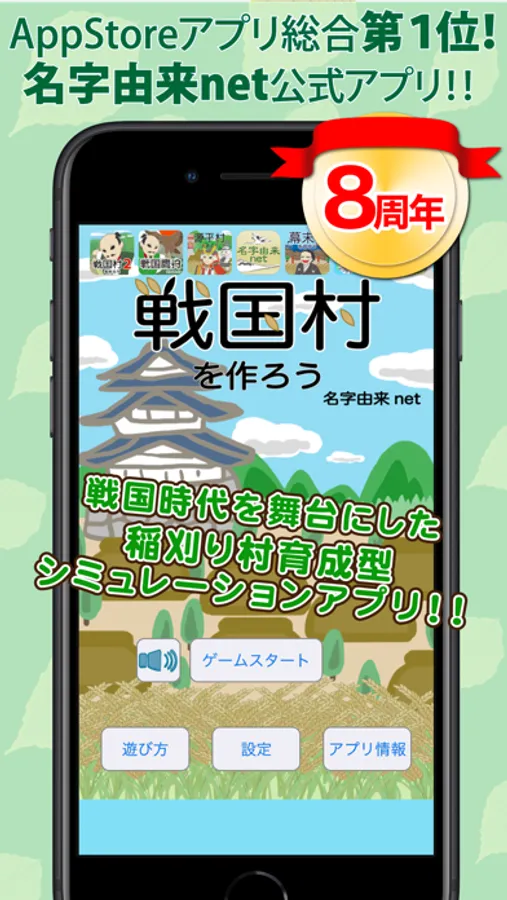 名字(苗字)に興味のある方もない方も、自分の名字を冠した村を成長させ、天下統一を果たすことができるゲームです。ランキングでは日本中で最も強い村と村の発展を競うことができます。家族が少人数化していく現代だからこそ、稲を刈り自分の家族を増やし、村が大きくなる醍醐味を体験しましょう。大ヒットゲーム「弥生村を作ろう」に続く第二弾、群雄割拠の戦国時代を舞台にした「稲刈り村育成型シミュレーションアプリ」です。