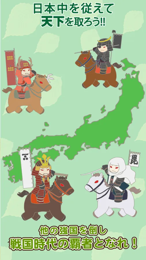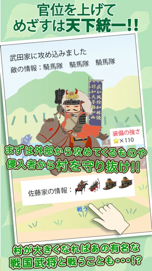 さあ、いまからこの広い日本を代表する「戦国村を作ろう」。そして武田、上杉、織田、毛利といった群雄割拠の強敵を倒し、あなたの村が、天下統一を果たすのです!
